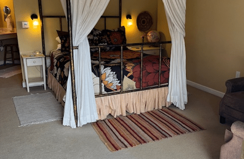 Reserve this romantic guestroom at our bed and breakfast for your getaway in Colorado Springs. A custom-crafted mosquito netted four-poster bed right “Out of Africa” welcomes you in this very comfortable, very spacious room with artifacts and photographs collected on safari. From your private hot tub high above the street, you look out over the front range and Cheyenne Mountain. Delightful accommodations, ADA approved.